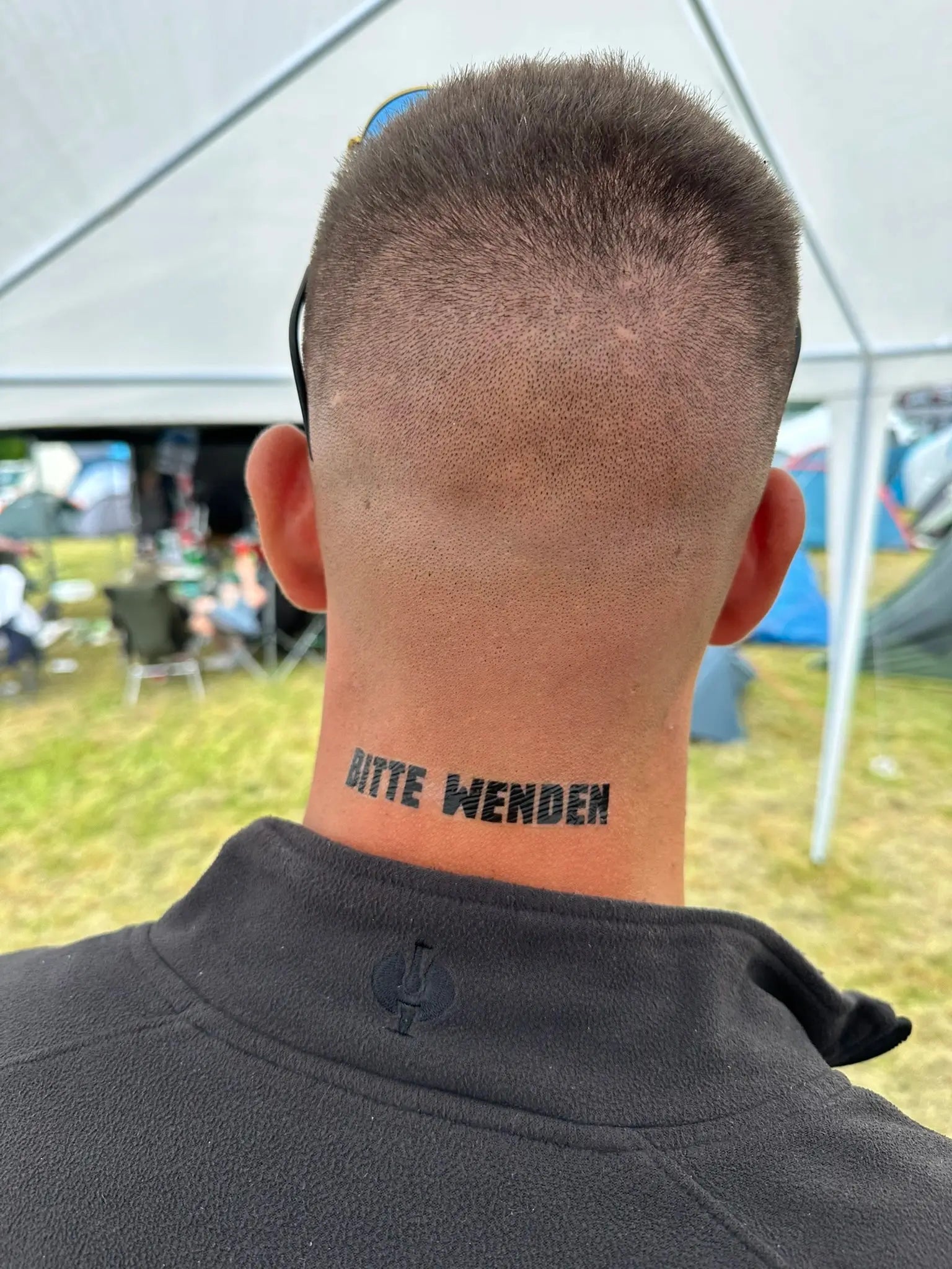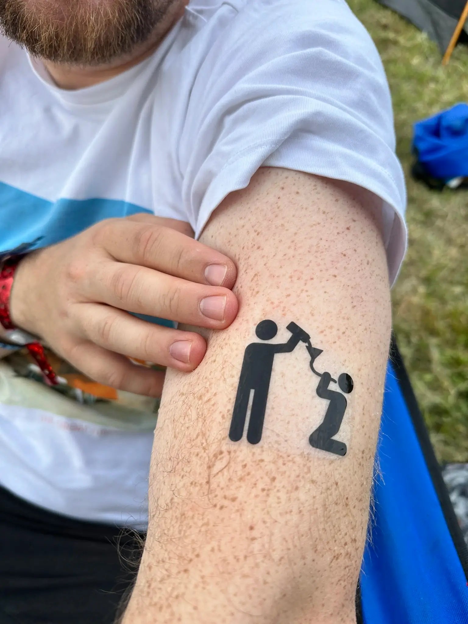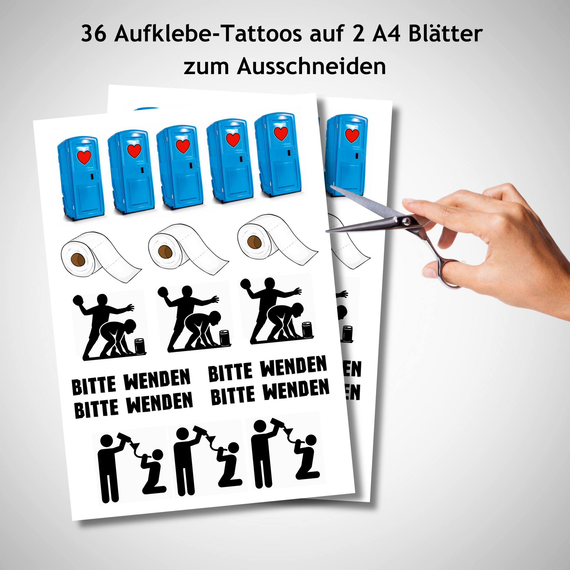 - Zahlreiche temporäre Tattoos mit typischen Festival-Motiven (z. B. Dixi-Klo, Bierbong, „Bitte wenden“, Klopapierrolle)