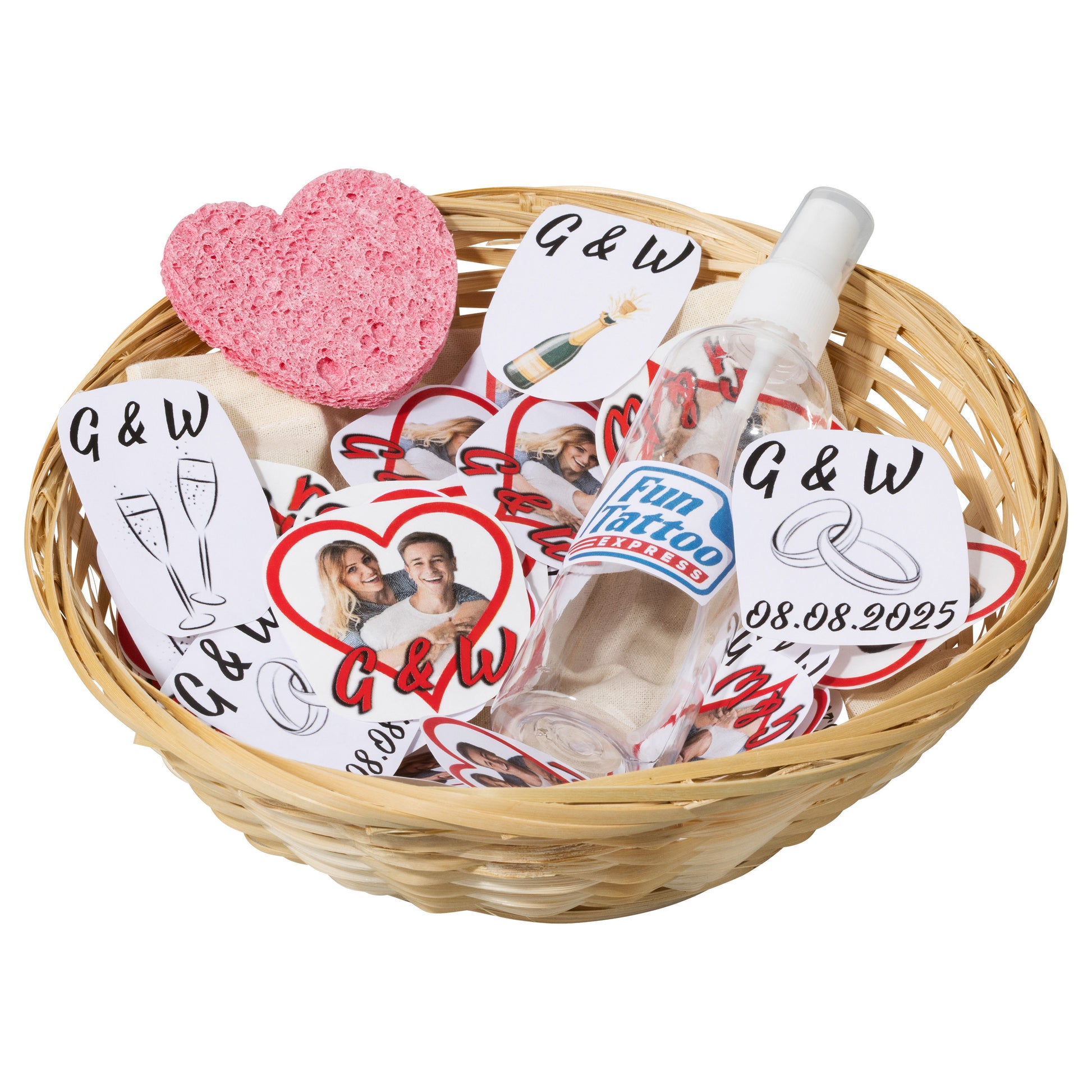 -Zahlreiche temporäre Tattoos mit euren Initialen (z. B. G & W), eurem Hochzeitsdatum und romantischen Motiven (Ringe, Sektgläser, Herzrahmen mit Foto)